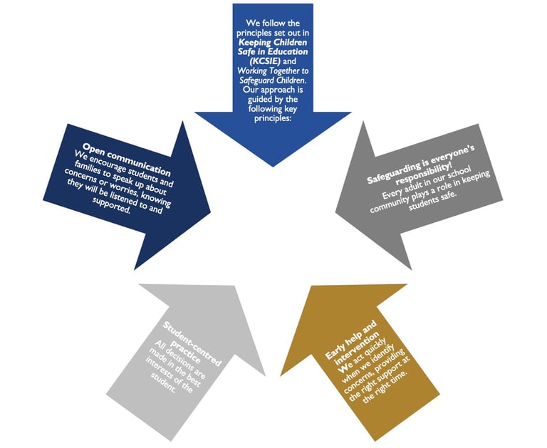 We follow the principles set out in Keeping Children Safe in Education (KCSIE) and Working Together to Safeguard Children.